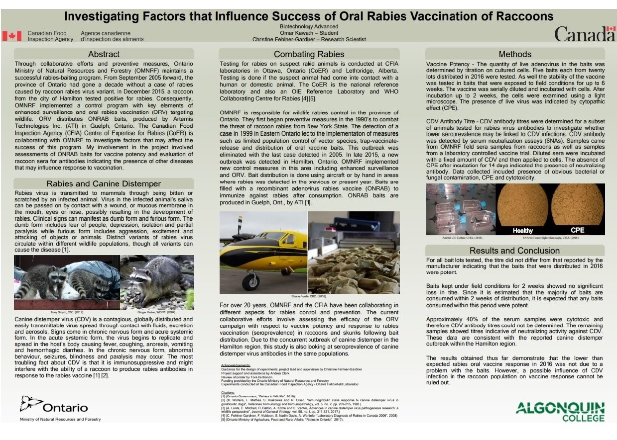 Capstone project: Assisted federal & provincial collaboration studying factors influencing oral rabies vaccination success in raccoons (image).